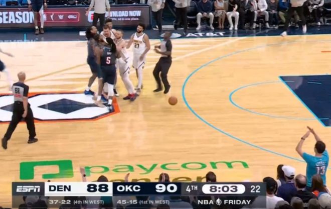 雷霆球员杰林冲上去帮队友多尔特出头,他与约基奇推搡互相撕扯球衣,双方多位球员围拢在一起爆发冲突。